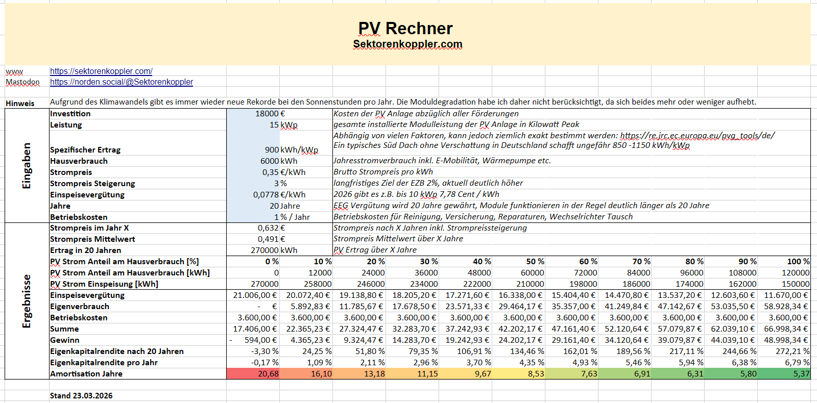 PV Rechner: Kleines Tool, um die Investition in eine PV Anlage zu auf Wirtschaftlichkeit zu überprüfen und Mondpreise bei Angeboten leichter zu entdecken. | DOWNLOAD |